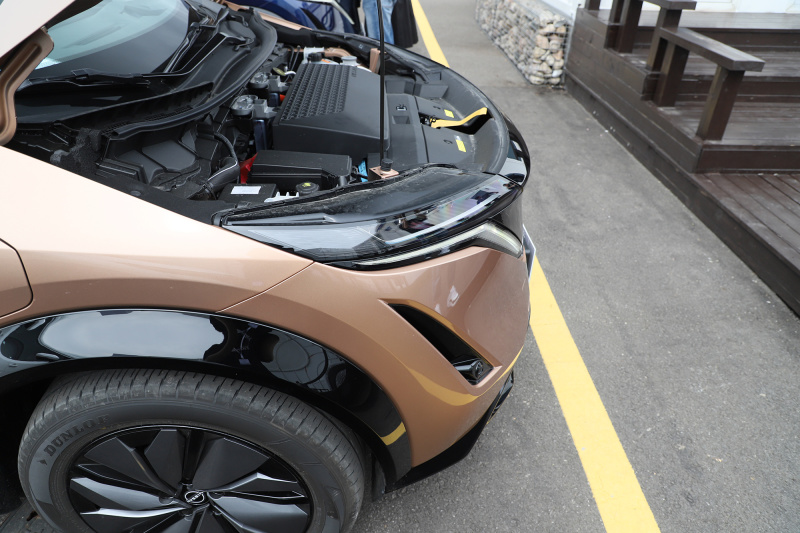 日产Ariya是没有前备厢空间的,前舱部分主要放置电机、电控以及OBC车载充电机。从实拍来看,日产Ariya车头部分还预留了大量的碰撞缓冲空间,为电池舱内的电池散热也留足了空间。