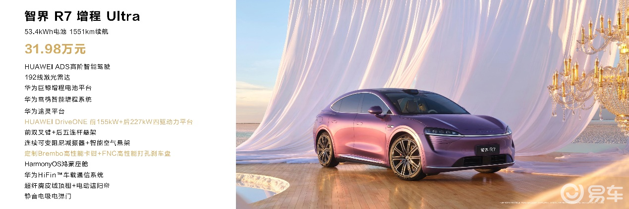 爆款轿跑suv智界R7推出增程新版本,在华为雪鸮智能增程系统极致静谧与低油耗优势基础上,带来53.4kWh大电池和四驱增程系统,满足用户对更高续航、更强性能的追求。其中,智界R7增程Max CLTC纯电续航达360km,城市纯电使用一周一充;满电满油CLTC综合续航可达1673km,WLTC百公里油耗低至5.68L,行驶里程更长,出行成本更低。智界R7增程Ultra搭载华为DriveONE四驱系统,零百加速仅需4.9秒,配合满血途灵平台拥有82.2km/h麋鹿测试成绩,提供极致操控的爽感和可油可电的便捷。智界R7增程新版本的上市,将进一步强化智界R7在细分市场的竞争力,夯实“油电双强”的车型布局。