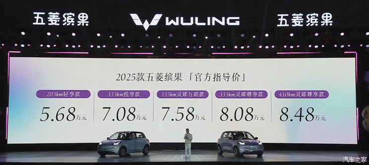 [车讯 新车上市] 日前,我们从官方获悉,2025款五菱缤果(参数|询价)正式上市,共推出5款车型,售价区间为5.68-8.48万元。5月31号之前,推出限时先享置换一口价,起售价为5.38万元。新车定位纯电动小型车,作为年度改款车型,将针对车辆的部分配置进行升级优化。