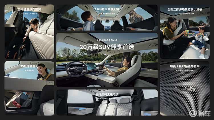 得益于全景天幕,全新领克08 EM-P前排头部空间再提升。后排纵向空间近1300mm,可满足身高110cm小朋友在车内直立行走。同时,新车内还提供35处储物空间,无论大物小物,都能轻松便捷的放取。后备厢容积545L,二排支持四六比放倒,最大可扩容至1277L,像行李箱、露营天幕、折叠座椅、儿童自行车等物品均可轻松容纳,全家出行承载无忧。
