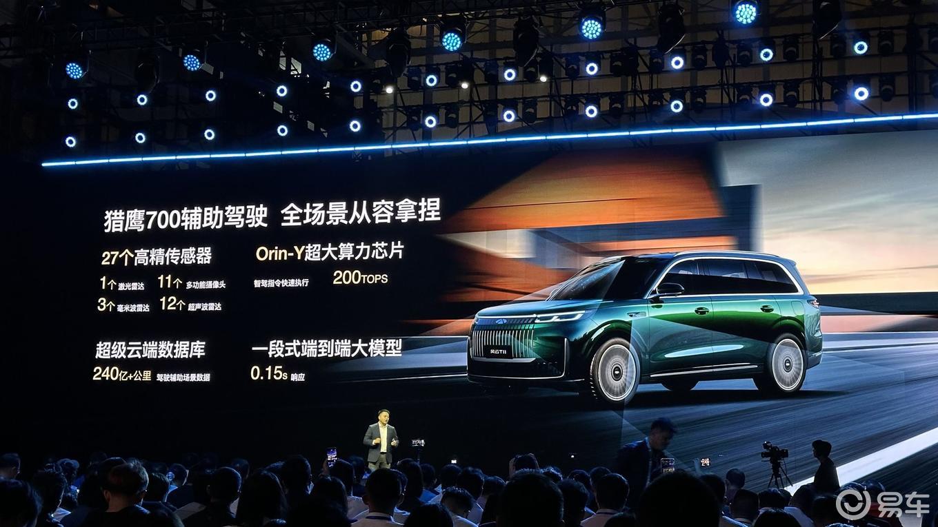 风云T11全系标配猎鹰500驾驶辅助系统,覆盖高速noa、城市通勤NOA及全场景泊车辅助场景。高阶版本还搭载猎鹰700系统,配备27个感知单元与200TOPS算力芯片,支持高速NOA、端到端城市NOA与跨楼层记忆泊车能力。
