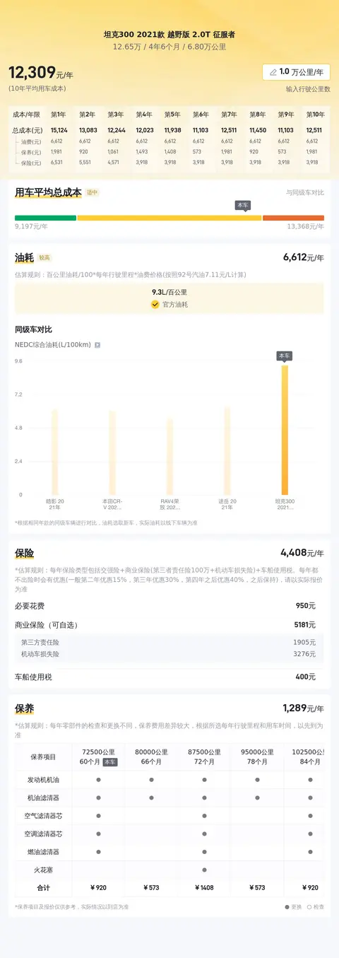 据估算,同级车的最低用车成本是11778元/年,最高是16931元/年,坦克300 2021款 越野版 2.0T 征服者是12370元/年,用车成本适中。