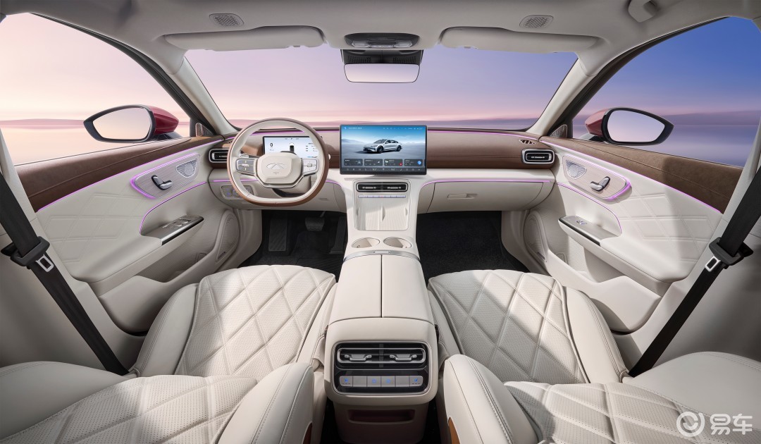 内饰方面,新车采用简洁雅致的环抱式座舱布局,中控台线条平直,搭配双色双辐式多功能方向盘和悬浮式设计中控多媒体触摸屏,营造出科技氛围。全液晶仪表盘与物理功能按键、无线充电面板等实用配置有机结合,保证了操作的便捷性。四座版车型特别采用了棕/米白双色配色,辅以高级材质包裹,提升了座舱的行政级豪华感。通道区域整合了空调出风口、杯架等元素,布局合理且人性化。