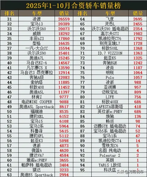 凌渡(图片|配置|询价)仅位居第31名,宝马i3、沃尔沃S60仅有2万多辆,型格销量还不及威朗,大众CC、奥迪A7L都是1.5万辆,马自达3 昂克赛拉未进前40名,林肯Z、捷豹XEL都不足万辆,起亚K3仅5000辆出头,骐达、飞度已失去市场青睐,标致508L、起亚K5、大众Polo前10个月销量只有1000多辆,市场表现早已今非昔比。