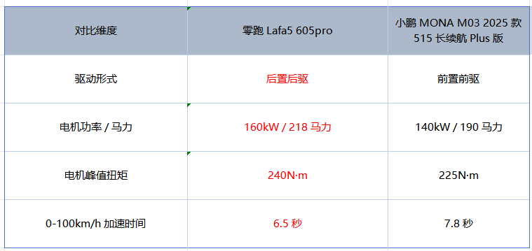年轻人选车,除了颜值和配置,开起来爽不爽也很重要。这两台车在驱动形式和底盘配置上的差异,直接决定了它们的驾驶质感完全不同。零跑Lafa5 605pro采用的是后置后驱的布局,搭载的是160kW(218马力)的永磁同步电机,峰值扭矩240N・m,0-100km/h加速时间能做到6.5秒;而小鹏MONA M03则是传统的前置前驱布局,配备的是140kW(190马力)的永磁同步电机,峰值扭矩225N・m,零百加速时间是7.8秒。