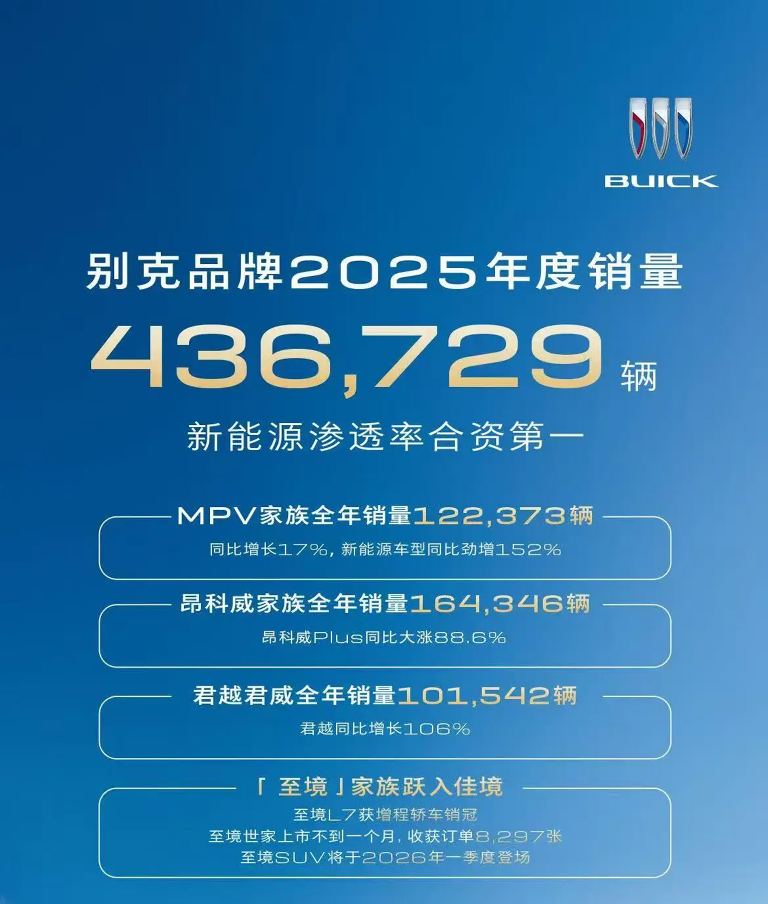 需要指出的是,2025年上汽通用别克全年销量达436729辆,多款核心车型表现抢眼。其中,昂科威家族以164346辆稳居销量主力,昂科威Plus同比大涨88.6%,家族累计产销超190万辆。MPV家族全年销122373辆、同比增17%,新能源矩阵占比超50%,同比激增152%,新晋上市的GL8 陆尚上市不足半年产量破5万辆,强势拉升品牌新能源MPV市场声量。此外,君越、君威合计销量破10万辆,君越同比翻倍增长,产品焕新成效显著,别克在燃油与新能源赛道均实现稳步突破。