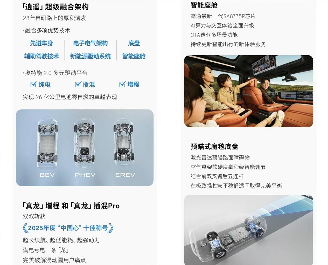 混合动力方面,“真龙”增程系统与“真龙”插混Pro系统双入选“中国心”十佳动力系统,印证了其在混动技术领域的自主研发能力已跻身行业第一梯队。