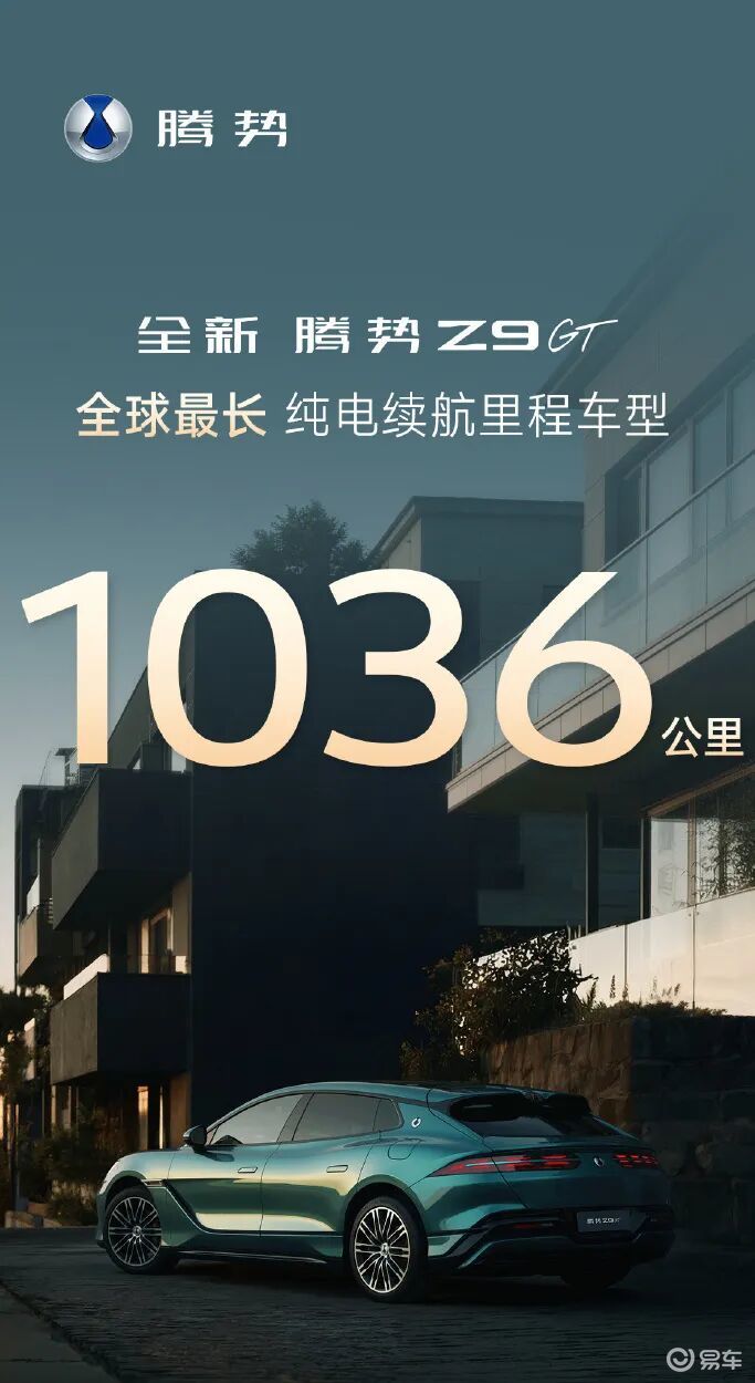 就在今天,官方也发布了一则海报,里面显示腾势Z9GT的纯电续航来到1036km。