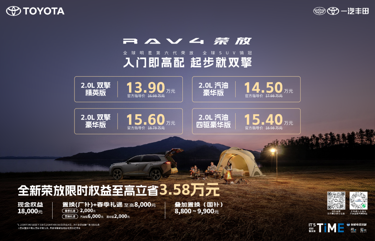 在此基础上,多重福利还可叠加享受。2026 年 3 月 31 日前完成下订,且在 4 月 30 日前开具发票的荣放全系用户,可享受一汽丰田推出的至高 8000 元春日礼,其中包含春季礼遇与置换补贴,覆盖新老购车用户;同时,用户还能同步申领至高约万元的国家置换补贴,三重优惠叠加之下,购买全新荣放至高可省 3.58 万元,双擎精英版实际到手价仅 13.9 万元,汽油版豪华版也低至 14.5 万元,四驱版本等车型也有相应优惠,全系均享福利,无任何消费套路,拒绝期货等待,现车现提让购车更省心。