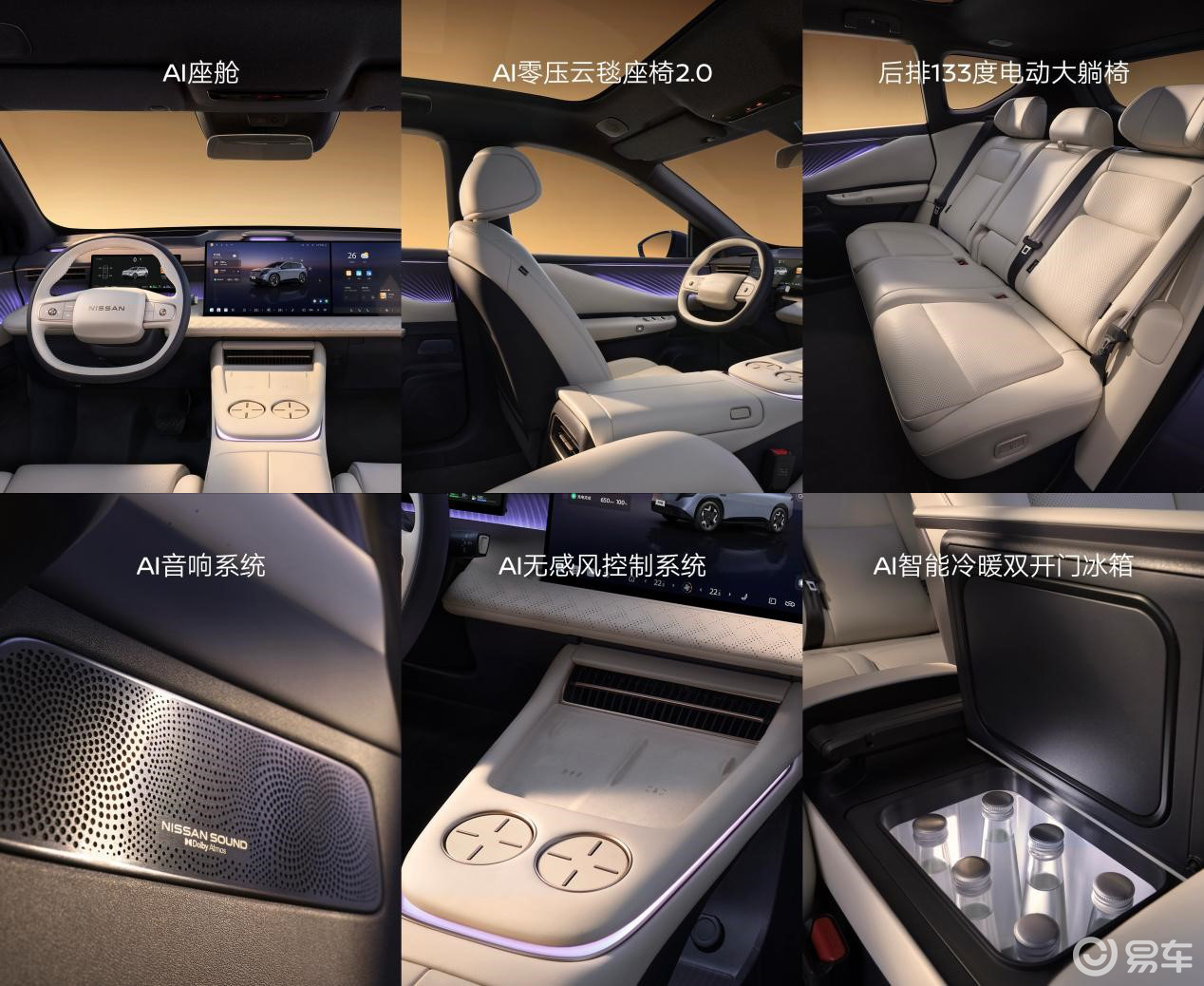 在舒适性配置上,NX8搭载AI舒享五件套。AI座舱基于NISSAN OS 2.0实现五屏联动,“小尼AI智能体”语音控车能力提升25%。主驾AI零压云毯座椅2.0配备53个高精度传感器,可实时探测全身压力变化并调节气囊支撑力;前排AI零重力座椅与后排133度电动大躺椅均支持电动调节、通风、加热、按摩功能。Nissan Sound AI音响系统搭载25个扬声器,采用7.1.6.2杜比全景声布局,配备AI调音大师与智能声场跟随。AI无感风控制系统通过智能风控算法识别脸部位置,实现“有凉意、无风感”的出风体验。双开门AI智能冷暖冰箱支持零下6摄氏度至55摄氏度宽温域调节,具备遗忘提醒功能。