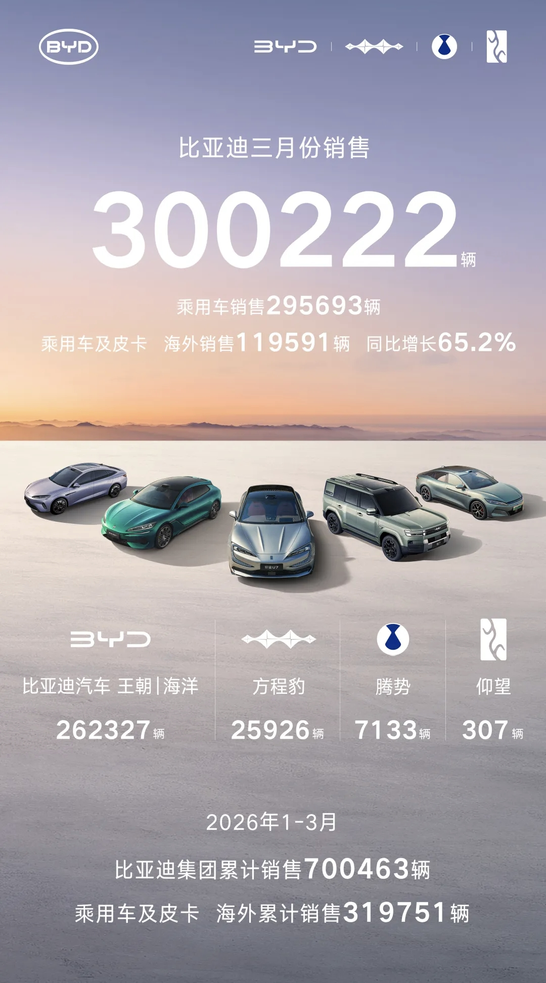 而就在前一天,比亚迪刚刚交出了2026年3月的销量成绩单。据比亚迪发布的公告,2026年3月其新能源汽车销量为300222辆,环比增长约57.8%,强势站上30万辆关口,连续第58个月蝉联中国新能源汽车销量冠军。其中乘用车及皮卡海外销售119591辆,同比增长65.2%,海外销量已连续五个月稳定在10万辆以上,占总销量近四成。今年1-3月,比亚迪集团累计销售700463辆,海外累计销售319751辆。